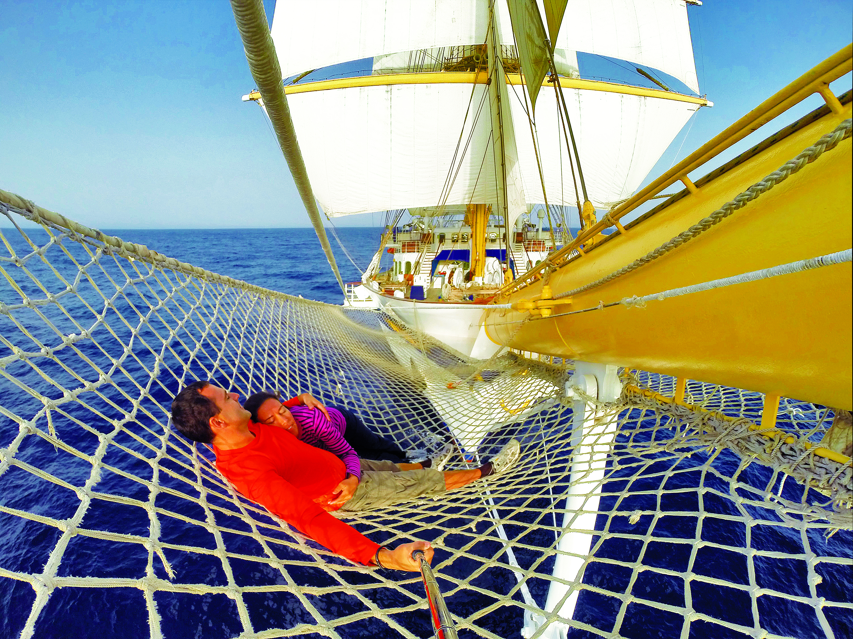 KH: durch die Individualität: maximal 170 bzw 227 Gäste an Bord, dazu eine Crew von 75 bzw 105 Personen. Es werden vorwiegend kleine Häfen und Buchten angelaufen. Wir haben meistens Gäste aus 12 bis 15 Nationen an Bord, d.h. unser Publikum ist sehr international, es gibt keine aufwändigen „Las Vegas-Shows“ am Abend, sondern persönliche, unaufdringliche Unterhaltung. Tagsüber bieten wir spezielle Aktivitäten, wie z.B.: Mastklettern, vorne im Bugsprietnetz liegen, Knoten- und Navigationskunde, die beliebte „Captains story time“, uvm.
