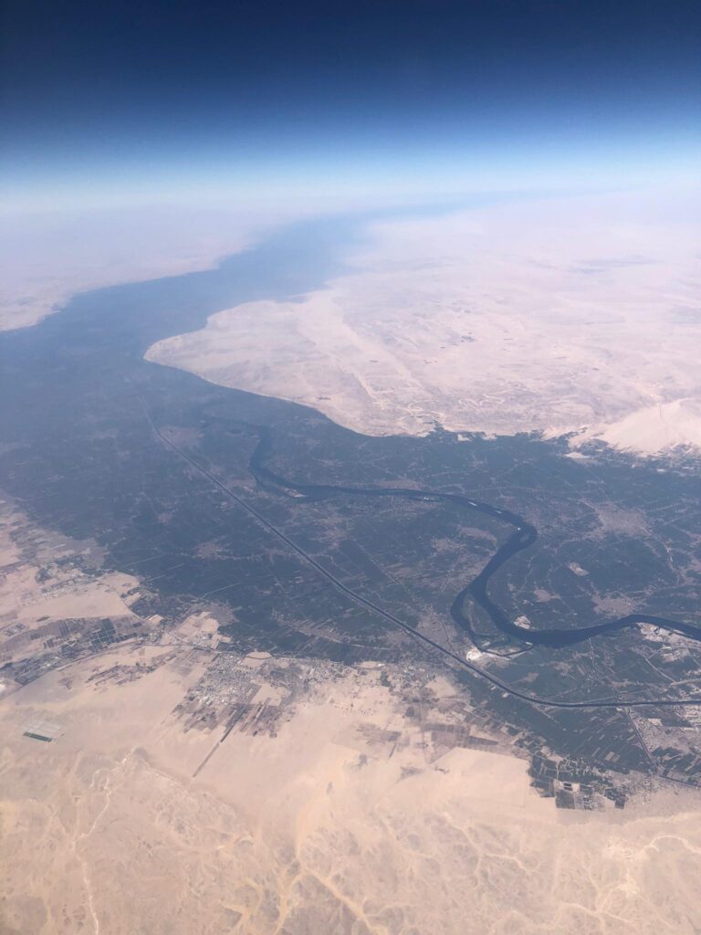 Euphorisiert war ich über meinen Fensterplatz. Der Überflug über das Gebirge der ägyptischen Wüste und das darauf kommende Niltal ist sensationell. Erst hier wird einem die Grösse und die Weite dieses Landes mit seiner herausragenden Geschichte bewusst.