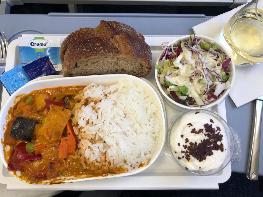 Der Höhepunkt war dann wie immer das Mittagessen. Das Catering in Zürich war hier dafür zuständig, auf die Maschine geladen wurden etwa 60% Fleisch- und 40% Vegi-Gerichte. Da sich die Reihen vor mir alle für Fleisch entschieden haben und ich wohl so aussehe, wie man es mit mir machen könnte, wurde ich gefragt, ob ich mich auch dem Vegi-Gericht erbarmen würde. Der charmanten Nachfrage habe ich Folge geleistet und das vegetarische Thai-Curry war schmackhaft, wie auch der Salat mit französischer Sauce und dem Creme-Dessert dazu. Kein Jubelschrei aber solide. Wein und Soft-Drinks wurden dazu ebenfalls gereicht. Das Geschirr kommt im Vergleich zur SWISS etwas (böse gesagt) billiger daher und es werden auch keine Stoffservietten gereicht. Der Kaffee danach wurde natürlich serviert und kamen die für die Business Class zuständigen Flight Attendants mit Getränken nachher nochmals 2 Mal vorbei.