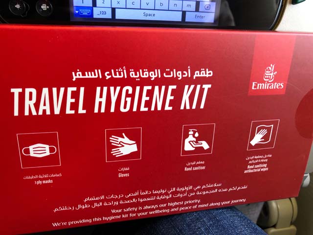 Im Flugzeug erhält jeder Passagier aktuell ein „Travel Hygiene Kit“, das drei Masken, Handschuhe, Desinfektionsmittel und Desinfektionstücher enthält.
