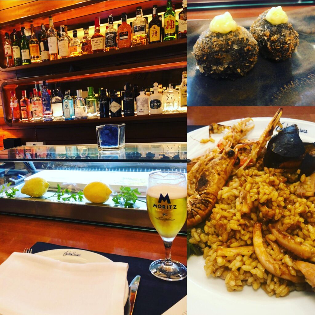 Irgendwie fühlte ich mich schuldig, dass ich bereits am 2. Tag schon in der Hafengegend fremd ging. Doch die Empfehlung des Hoteldirektors, welcher sagte, dass schon sein Grossvater dort ein und aus ging, hat mich einfach zu „gluschtig“ gemacht. Und ich hatte Lust auf Meer im Mund. Da ist ein Gang zum Galizier nie fehl. Im Restaurant Carballeira wurde ich von Herren im gesetzten Alter sehr freundlich empfangen, Platz genommen habe ich im sehr schön eingerichteten Traditionsrestaurant an der Theke und habe mir vom überaus schmackhaften (und katalanischen) „Moritz“ Bier einschenken lassen. Meine Wahl der schwarzen Tintenfisch-Kroketten zur Vor- und der Meeresfrüchte-Paella (natürlich in der Pfanne serviert) als Hauptspeise war nicht unbedingt originell, doch eine Punktladung für den Gaumen. Auch Nicht-Fisch- und Seafood-Esser würden hier fündig werden.