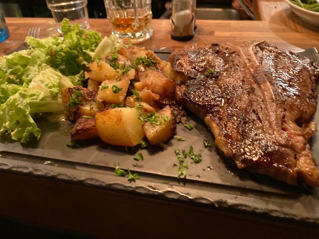 Das T-Bone Steak war zart und geschmacklich wunderbar aromatisch, weil es perfekt zubereitet war. Gegrillt wird das Fleisch im Kamin auf einer Eisenplatte und Gäste im Erdgeschoss haben je nach Tischwahl die Möglichkeit dem Chef-Koch beim Grillen zuzusehen. Die dazu gereichten Bratkartoffeln waren vorzüglich wie auch der perfekt dressierte Salat. Standard-mässig wird ein Bottich Senf mit aufgetischt – ein Senf der es in jeden Feinkostenladen schaffen würde und dann noch immer ausverkauft wäre.